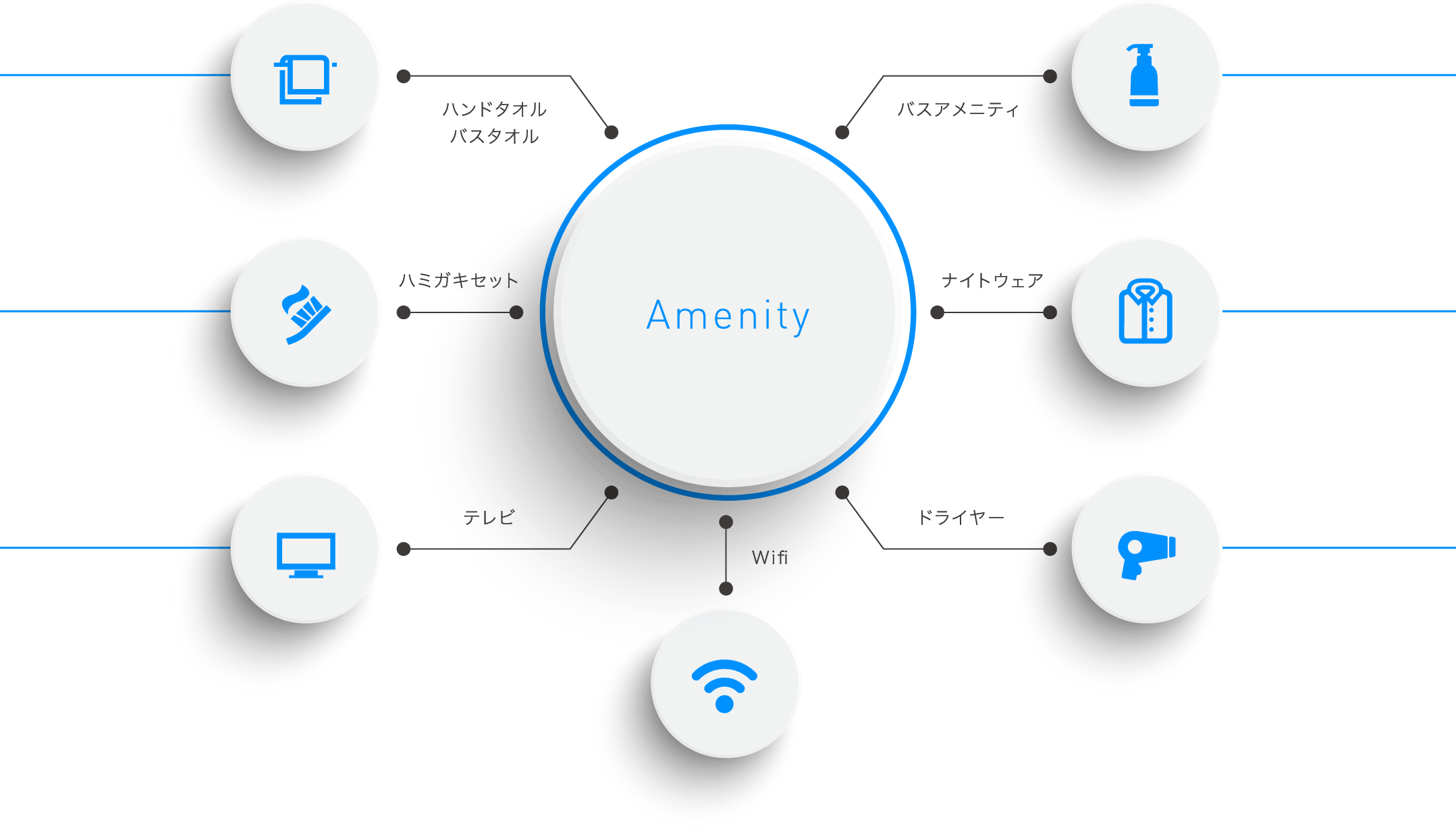 お越しいただいたお客さまへ心地よく,快適にご滞在して頂く為、各種アメニティグッズを用意しております。